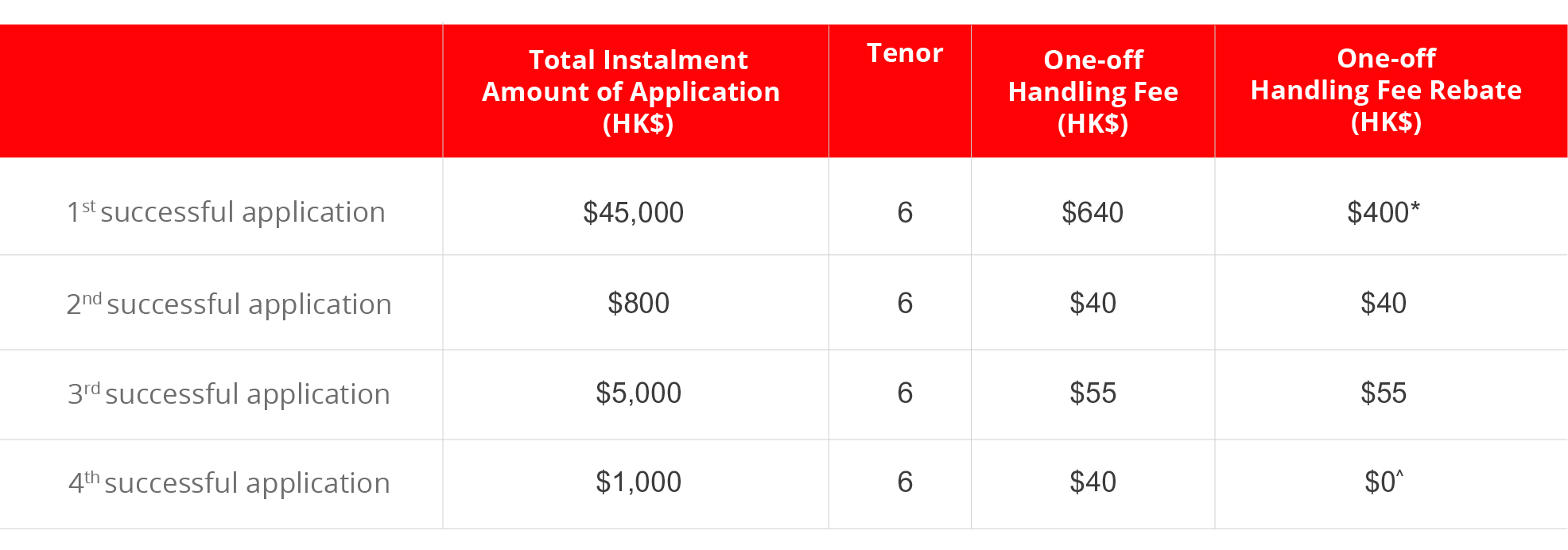Example: A new Auto Flexi Shopping customer set up Auto Flexi Shopping instructions via DBS Card+ app, spent HK$45,000, HK$800, HK$5,000 and HK$1,000 respectively and successfully applied for 6-month Flexi Shopping that charged one-off handling fee based on the Auto Flexi Shopping instructions for each of the spending transactions during the promotion period, he/she can enjoy 3 rebates of HK$400 (capped at HK$400), HK$40 and HK$55 respectively, which are equivalent to the one-off handling fee payable for the Eligible Flexi Shopping. As the Fee Rebate only applied to the first 3 successful applications, the 4th successful application is not eligible for any Fee Rebate.
