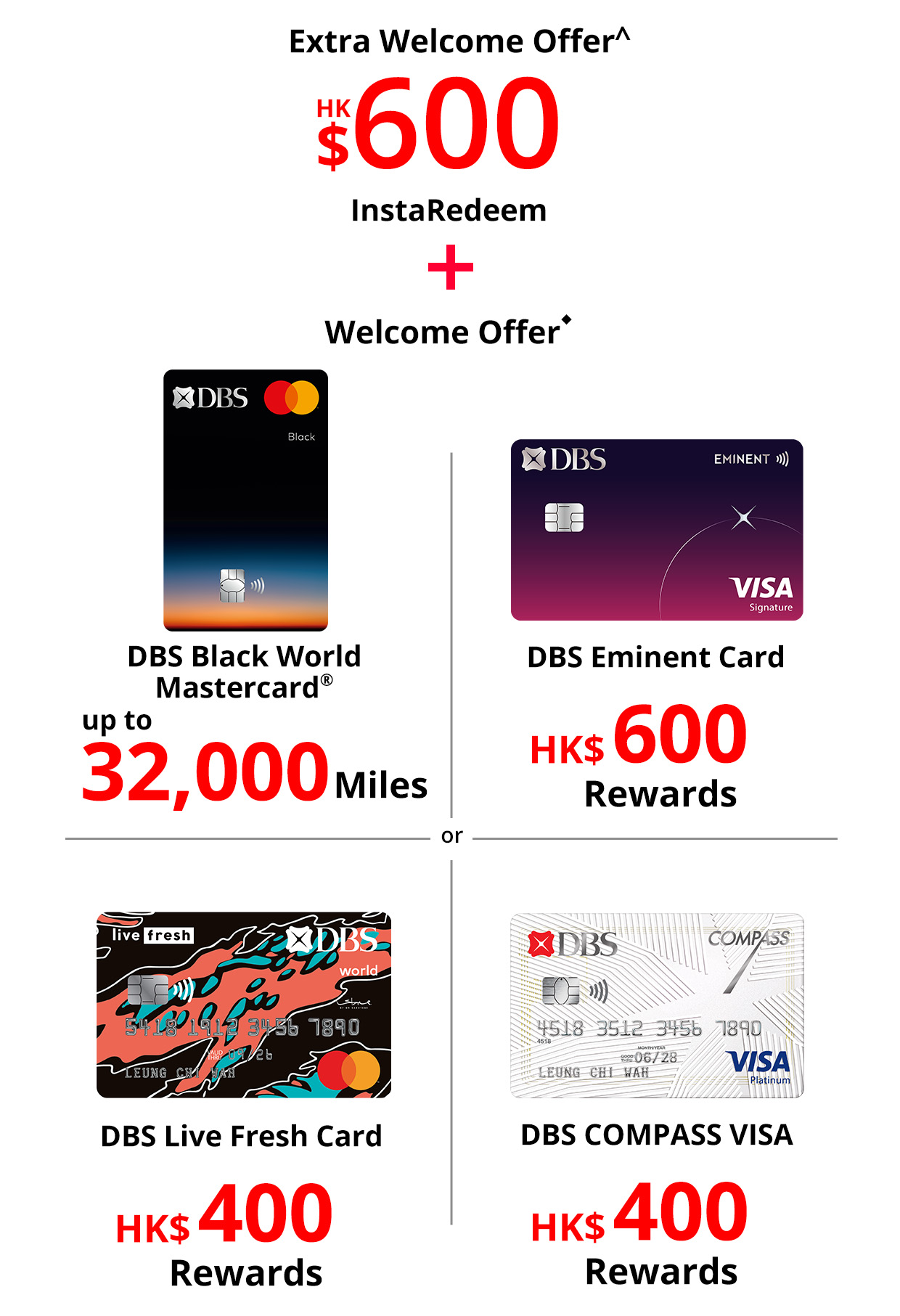 ^ DBS Credit Card x HKT Extra Welcome Offer of HK$600 InstaRedeem Promotion is subject to Terms and Conditions, please click here for details.