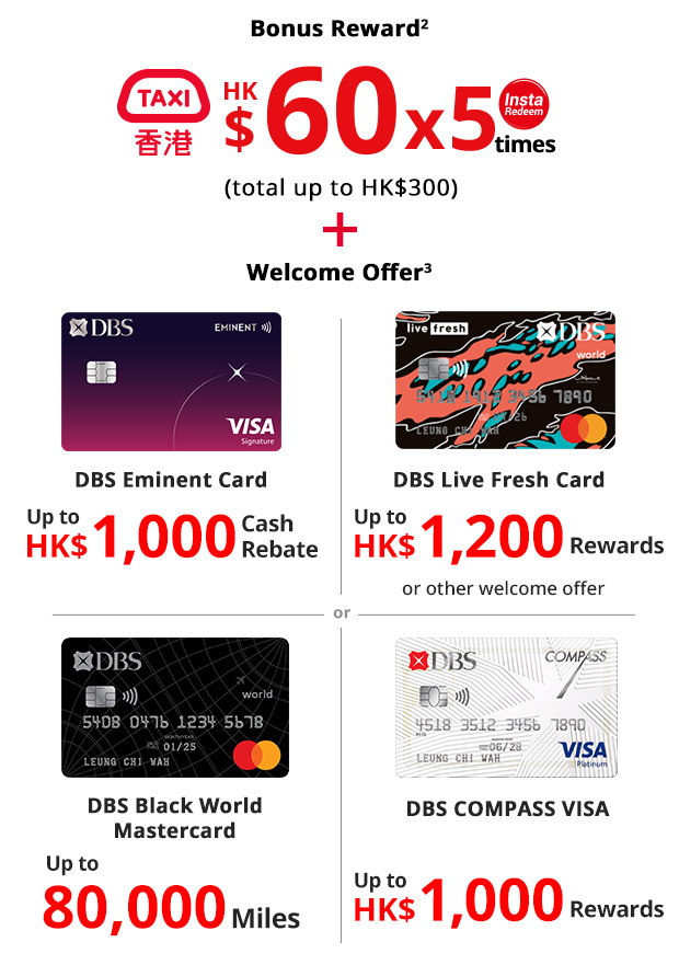 2. For details of DBS x HKTaxi Extra Welcome Offer of HK$300 “InstaRedeem” Amount Terms and Conditions, please click here. Upon successful card approval, please turn on "InstaRedeem" under "Push Notification" in DBS Card+ setting in order to enjoy the extra Welcome Offer.