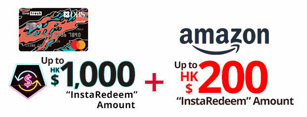 New customer simply apply DBS Live Fresh Card through the designated link to enjoy welcome offer of up to HK$1,000 “InstaRedeem” Amount and an extra welcome offer of Up to HK$200 “InstaRedeem” Amount with spending at Amazon.com!