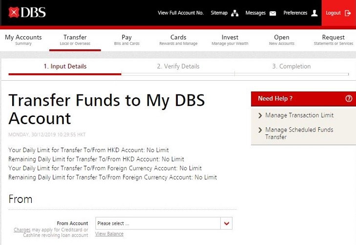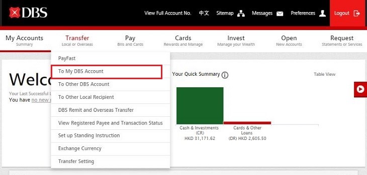 At the top menu bar, select “Transfer” then select “To My DBS Account”