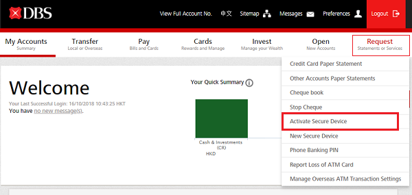 If you do not activate the Secure Device, you will not be allowed to perform certain transactions on DBS iBanking. Please click here for details.