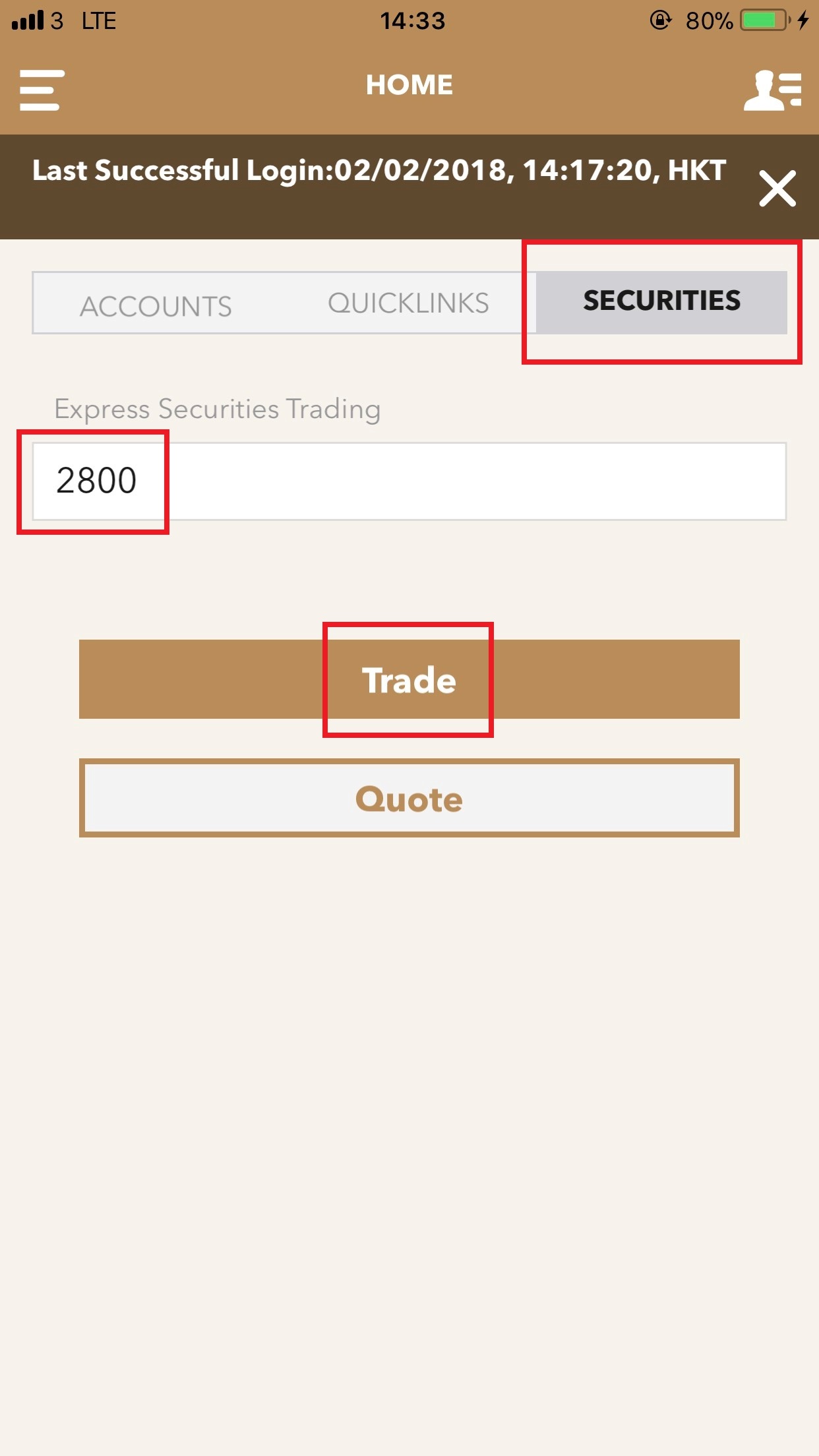 1. To buy stock, please login DBS digibank HK & choose “Securities”. Input Stock Number under “Express Securities Trading”, then click “Trade”.