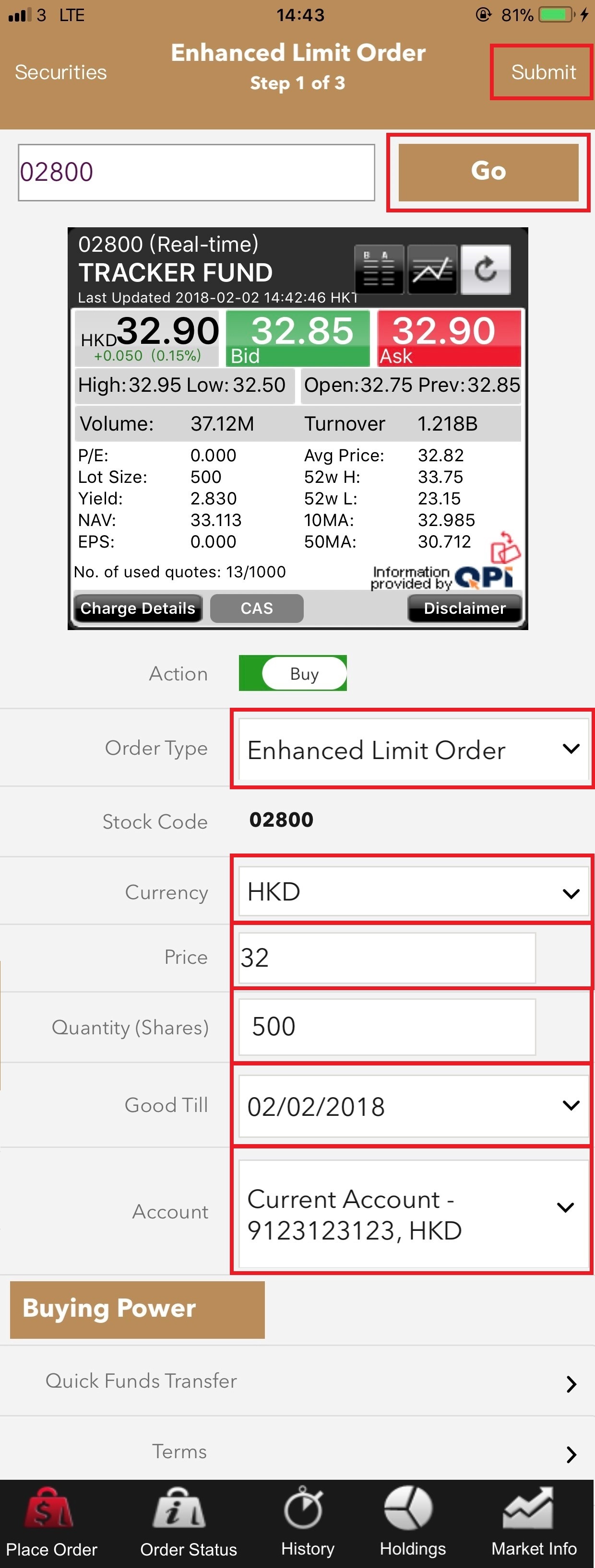2. To input Stock Trading details, please click “Go”, you may select “Enhanced Limit Order”, “Market Order”, “At-auction Limit Order” under “Order Type”.