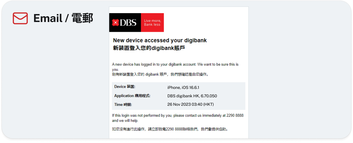 New Device Detection is a security measure to notify customers when we detect a new mobile device being used for the first time to log in to DBS digibank HK.