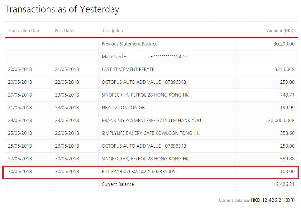 Note: If payment is made by Credit Card, Cahsline Revolving Loan Account, or to payees under "Banking & Credit Card Services", "Credit Services", "Securities Brokers" categories, corresponding interest and handling fees may be charged. Please click here for details.