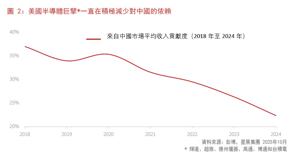 科技企業正在實現收入多元化。事實上,領先的半導體供應鏈企業一直在積 極實現營運和收入結構多元化,此趨勢在很大程度上受到美國日益嚴格的出 口限制的推動。星展集團對六家知名半導體和IC設計公司的追蹤顯示,來自 中國市場的收入佔比大幅下降,從2018年的近40%下降至2024年的約22%。 這種策略調整,無論是自願發起,或是迫於外部壓力,都削弱了這些行業領 袖對單一市場的依賴。如果特朗普政府加強出口管製或徹底禁止中國出口的 威脅成為現實,預計這些現在更加多元化的企業的增長和基本面受到的影 響將可控。