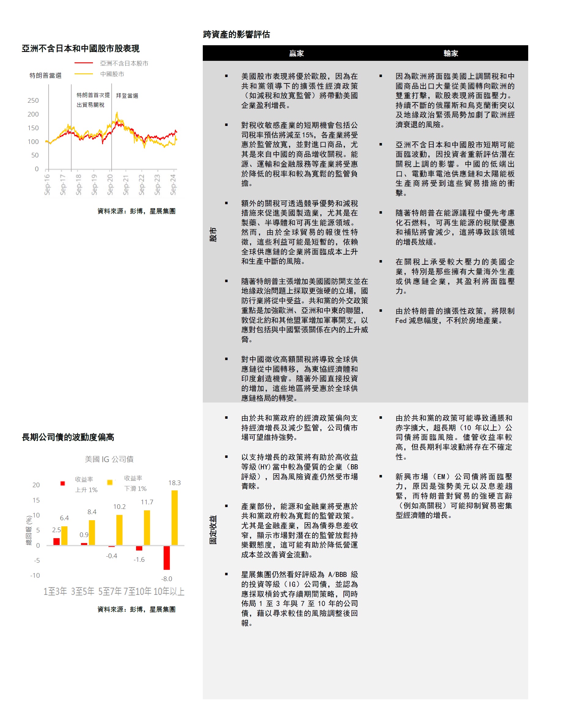 • 固定收益:在共和黨執政下,受惠於支持經濟增長的政策和放寬監管的傾向,有利於公司債表現。投資等級(IG)和高收益等級(HY)當中品質較佳(BB級)債券將獲得良好的支持