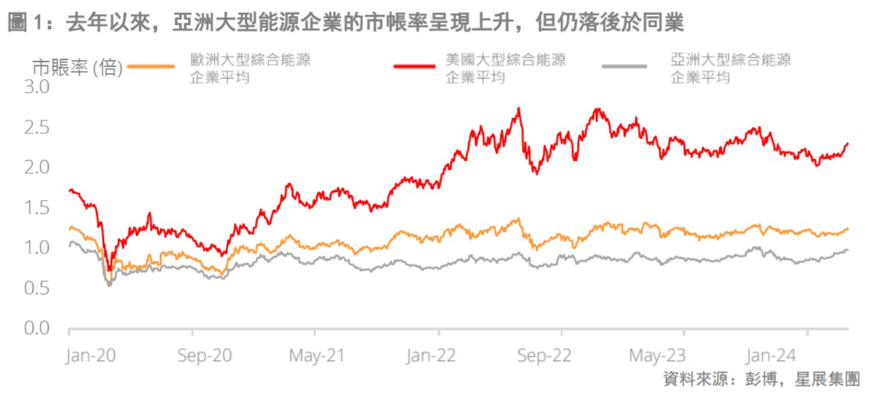 2021年至2022年疫情後的復甦期間,美國大型綜合能源企業升幅領先,標普石油和天然氣勘探與生產指數上升了約150%;經歷了2023年調整後,2024年恢復升勢,今年以來上升約15%。相較之下,中國主要大型綜合能源企業的股價在2021年至2022年僅上升40至50%,此後在2023年中國經濟全面重新開放後上升約50%,2024年初以來再上升30至50%。儘管股價上升,但亞洲大型綜合能源企業估值仍低於美國與歐洲同業(亞洲綜合能源企業市帳率小於1倍,市盈率約7至8倍,美國與歐洲大型綜合能源企業市帳率約1.5倍,市盈率約9至10倍)。儘管平均股東權益回報率(ROE)相差不遠,亞洲業者與歐美業者分別約13%與16%;平均股息收益率對於亞洲業者相對較佳(分別約6%與4%)。