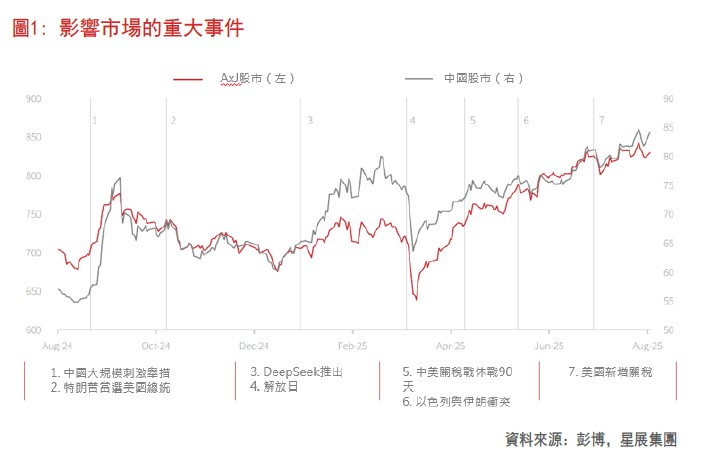 2025年,亞洲除日本(AxJ)股市面臨多重全球性衝擊;繼2024年底中國推出備受期待的大規模經濟刺激政策後,AxJ股市在年初迎來了一系列事件,例如美國總統特朗普成功連任、DeepSeek推出、美國與其貿易夥伴啓動對等關稅,以及以色列與伊朗爆發衝突等。儘管如此,AxJ股市今年以來仍然上升超過15%。