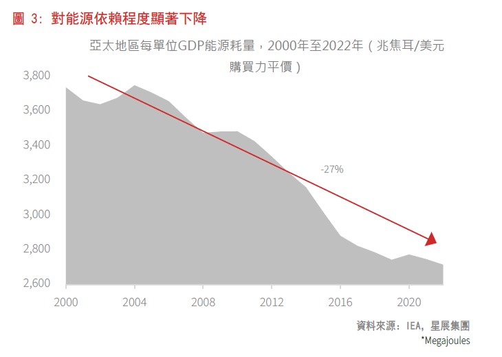 亞太地區每單位GDP能耗(衡量能源效率的指標)已顯著下降。這主要得益於三方面因素:採用較便宜的再生能源、轉向服務型產業的策略轉型以及技術應用的日益普及。這些轉變大幅降低了該地區對油價波動和能源供應中斷的敏感度,大幅提升抵禦能力。因此,原油供給變化本身不會阻礙經濟增長或引發失控的通脹。事實上,AxJ地區的通脹水平基本總體保持溫和,為各國央行提供了充足透過貨幣寬鬆刺激經濟增長的空間。