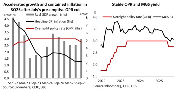 We expect short-end Malaysian Government Securities (MGS) yields to remain stable in the near term. This stems from the likelihood of Bank Negara Malaysia (BNM) maintaining its overnight policy rate (OPR) at 2.75% for the remainder of 2025, amid signs of economic growth resilience despite lingering external challenges from US tariffs. Malaysia’s advance real GDP growth surprised positively, accelerating to 5.2% yoy in 3Q25, driven by robust performance across all main sectors, including services, manufacturing, mining & quarrying, and construction. Factoring in this strong growth in 3Q with the resilient expansion of 4.4% yoy in 1H, the economy grew by 4.7% yoy in the first three quarters of the year – nearing the upper end of the official growth projection range of 4.0-4.8%.
