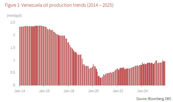 No significant short-term impact on oil prices. Seeing as how Venezuela holds the world’s largest proven oil reserves on paper – higher than Saudi Arabia (though this should be taken with a pinch of salt, as explained later) – oil is perhaps the most logical place to begin our analysis. Will the conflict in Venezuela move the needle when it comes to oil prices? Years of mismanagement, underinvestment, and sanctions have reduced Venezuela’s output to a fraction of historical levels, and it is no longer a significant player in global oil supplies. In the short term, we do not think there will be direct material impact on global crude supply amid current oversupply trends, but risk premiums could inch up along with higher volatility – amounting to a spike of up to 10% before re-adjusting. For now, our view on oil prices remains – rangebound at USD60-65/bbl levels for Brent in the near term. Nonetheless, Venezuela’s heavy crude grade is difficult to replace in certain refining processes, so prolonged disruption could tighten specific refined product markets like diesel and jet fuel.