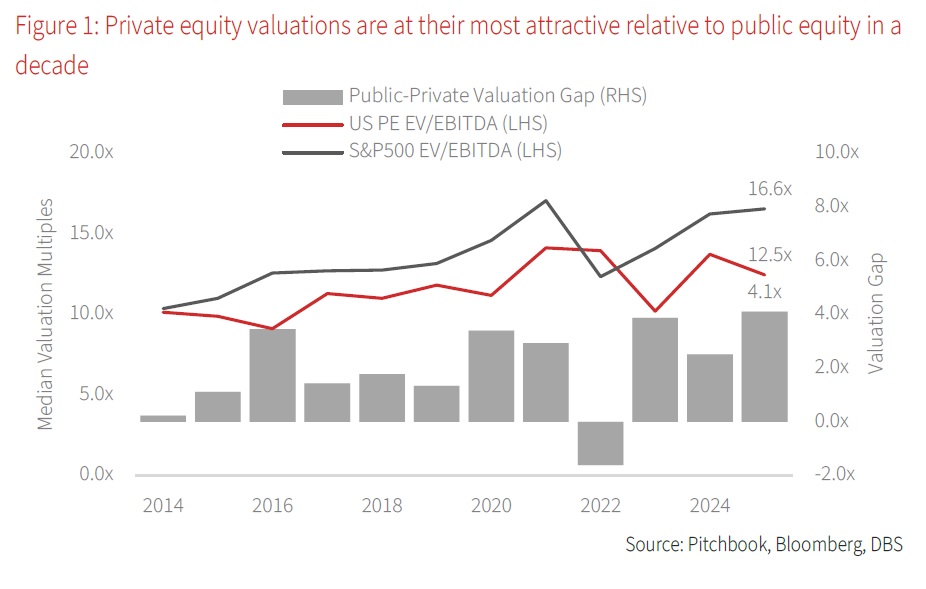 Relative value shifts back toward private markets. Private equity is undergoing a meaningful transition, and for long-term investors, this shift may be creating more attractive opportunities than we have seen in several years. To understand why, we must begin with valuations. Over the past few years, higher interest rates have slowed deal activity and moderated valuations. Meanwhile, segments of the public equity market, particularly large-capitalisation technology stocks, have appreciated sharply. The result is that private assets no longer look as relatively expensive as they once did. For investors, this creates a golden window of opportunity to capitalise on low entry multiples. Moreover, with rate cuts now set in motion, valuation multiples could see steady uplifts over time, creating a compelling case for private equity.