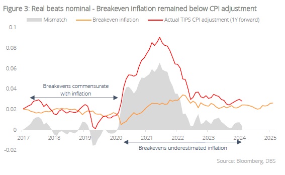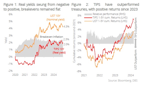 Real yields at a tipping point. The biggest headwind at the time was clearly the Fed’s aggressive rate hiking cycle, pushing real yields up to a 16-year high within a short span of 1.5 years. The difference for TIPS today, we believe, is that real yields have plateaued as the Fed has already begun a rate cutting cycle. Unless the Fed makes a complete u-turn and hikes rates again – which amounts to a calamitous blunder in forward guidance – the biggest headwind for TIPS is largely behind us. Moreover, a slowdown in growth, as several economic indicators seem to be flashing, implies that the Fed may need to bring down the levels of real rates in due time to provide further accommodation to the economy. Such turning points are often the greatest opportunities for nimble investors to capitalise on.