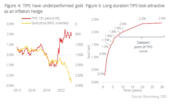 Other potential considerations. As an inflation hedge, TIPS yields and gold have had near perfect correlations before 2022 (Figure 4). Something drastic had occurred in that year which forced a decoupling of these inflation hedges, – you guessed it – war. As the US unilaterally froze USD300bn in Russian foreign holdings at the start of Moscow's invasion of Ukraine, countries were forced to make distinctions between TIPS and gold – the former is a debt instrument, while the latter was a neutral reserve asset. While we remain positive on gold, our take is that this decoupling cannot diverge forever; eventually the real yields on TIPS become enticing enough versus the yellow metal that pays no interest.