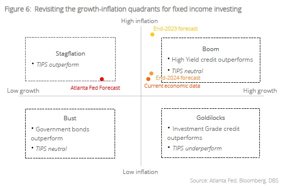 The bond that beats stagflation. Finally, as a reminder, TIPS sit uniquely in the upper left space of the growth-inflation quadrants for fixed income investing as the only security that performs well in stagflation (Figure 6). Yet TIPS, we believe, does not need stagflation to perform well. Just like the most of the fixed income markets, yields today are high enough for decent recurring income – for TIPS, however, more than a hedge for slower growth, mechanisms ensure that the purchasing power of future coupon payments are commensurate with inflation. What’s not to like?