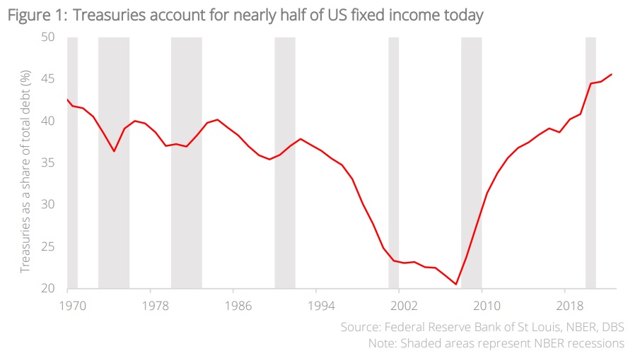 The era of big government (debt). Understanding it begins with an awareness of the shifting dynamics governing the supply-side of fixed income. Following the pandemic-era fiscal expansion, Treasuries have now reached a new record as a share of the fixed income market in the US – accounting for nearly half the total – despite the rapid development of the corporate credit markets since the turn of the millennium. As such, factors such as deficits, monetary policy, sovereign credit ratings, and central bank intervention have become as much, if not more crucial than corporate balance sheet strength and company earnings when devising fixed income strategy.