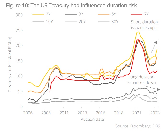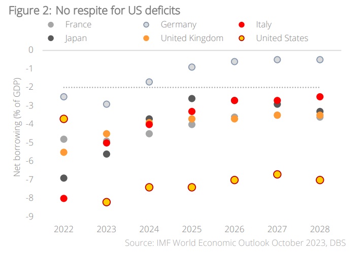 The great borrowing binge. This booming supply of US Treasuries is not surprising considering that US debt/GDP remains above 100%. What’s more surprising, is how tight monetary policy interacts with high debt to produce counterintuitive outcomes, a phenomenon we highlighted in our 4Q 2023 Global Credit outlook. Traditionally, high rates deter borrowing and money creation due to inhibitive costs of funding; but when the borrower is a price insensitive but indebted government – with mandatory spending needs such as social security, healthcare, and defence – high rates would pile onto the debt burden by raising the costs of interest servicing, resulting in a runaway train of never-ending government deficits. As such, while most developed nations are expected to reduce net borrowings in the years ahead, the IMF believes that US deficits would remain in the vicinity of 7% of GDP for much of the remainder of this decade.