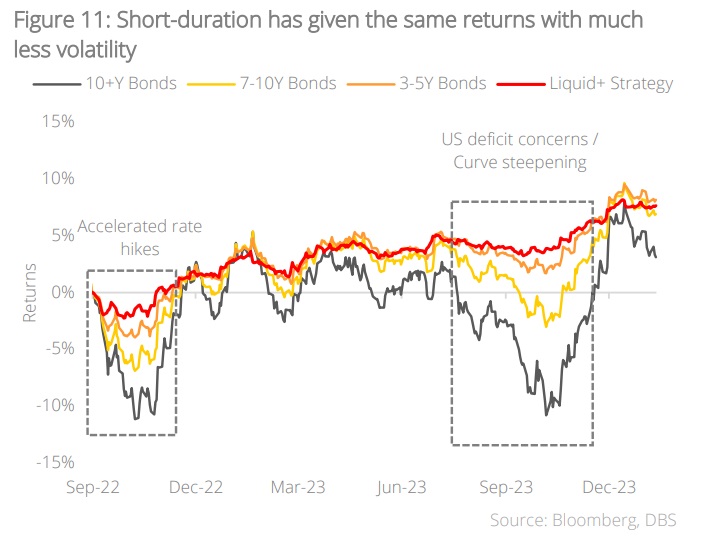 Our short-duration strategy remains relevant today. We had recommended a 3-5Y sweet spot for duration since 2022 noting this dichotomy of fiscal expansion/monetary contraction. Investors who have navigated the choppy waters of interest rate volatility since then would have recognised very similar returns with much less volatility. The Liquid+ strategy of even shorter-duration, high quality fixed income also fared relatively well in this regard. Given that this fiscal-monetary dichotomy remains at play, we find no compelling reason to take long-duration risk even at the brink of a cutting cycle.