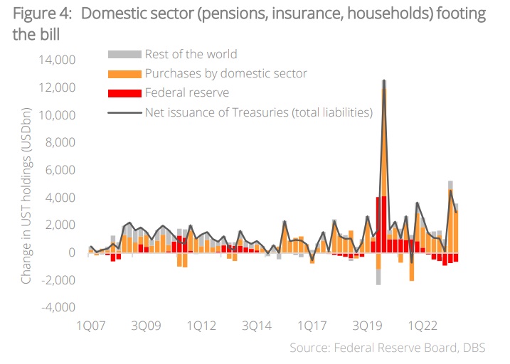 Who has been paying the bills? Such excessive deficits and Treasury issuances need equally excessive sponsors, but they aren’t your usual suspects of foreign reserves and central banks. Foreign participation in the US Treasury market has been on a steady decline since 2010; while the more recent (a) strength of the USD, (b) US sovereign ratings downgrade, and (c) deglobalisation narrative has left FX reserve managers more averse to US debt. Neither are the “buyers of last resort” in the previous crisis picking up the tab; the Fed and other global central banks are, on the contrary, busying themselves with unwinding their excessive balance sheets through QT.