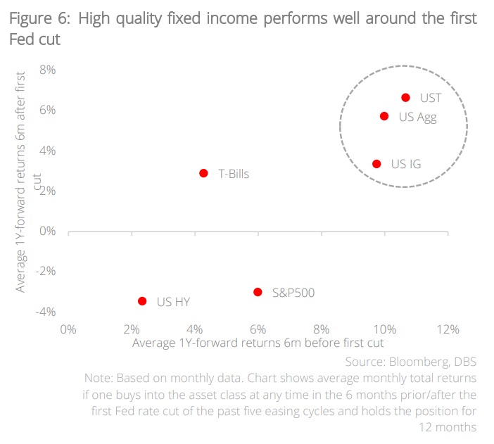 A. High quality issuers in the BBB/BB bucket. The corollary of a healthy business sector is the persistence of sanguine credit spreads. As such, we believe that fixed income investors are still better off with high-quality corporate credit due to (a) the spread premium over Treasuries, while also noting (b) more prudent financial discipline from corporates than governments in this cycle. Specific alpha opportunities could also exist for credit upgrades; a notable strategy being the picking of “fallen angels” (HY bonds in the BB+ category previously downgraded from IG) in anticipation of upside from spread compression. Investors need to be very selective, however, noting that it is only the highest quality fixed income that performs best in the vicinity of the first Fed cut after a hiking cycle.