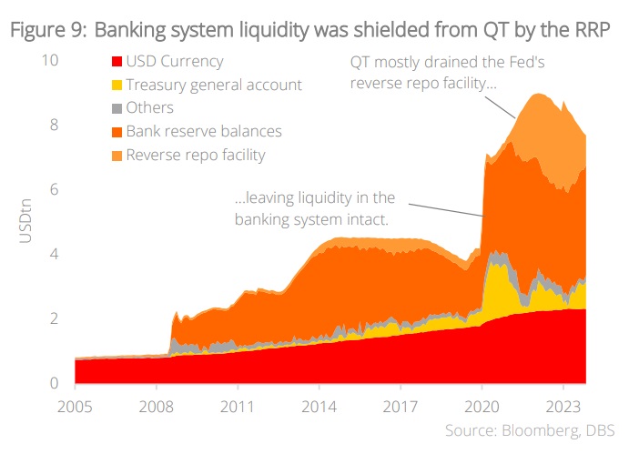QT had a “shock absorber”. Banking system liquidity had remained unscathed since the start of QT in mid-2022 largely due to the presence of the Fed’s reverse repo facility (RRP), which shielded systemic liquidity from drawdown. This we believe has supported the functioning of Treasury markets thus far. This RRP facility is set to be drained by June 2024, and unless the Fed tapers QT, bank reserves could rapidly decline after, affecting systemic liquidity. We are cognizant that the 2019 repo crisis was caused by reserve balances dropping below viable levels in the previous QT cycle.