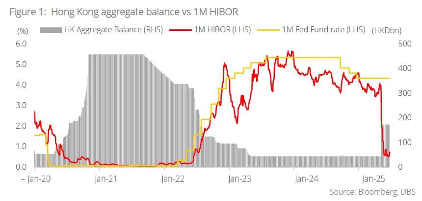 Sharp decline in HIBOR. HIBOR has declined sharply alongside USD weakness as recent US tariffs failed to lift the dollar — unlike during Trump’s first term — amid his continued preference for a weaker currency under the “Mar-a-Lago Accord” strategy. As the HKMA buys USD and injects HKD liquidity to maintain the HKD-USD peg, interbank rates have dropped, widening the HKD-USD spread. Notably, 1M HIBOR plunged from 4% in early May to below 1% within a month, as the Hong Kong aggregate balance rose from HKD44bn to HKD174bn. We maintain that the USD remains overvalued, with the US Dollar Index (DXY) expected to fall to 92.5 by end-2026, and forecast 3M HIBOR to settle at 2.3% by end-2025.