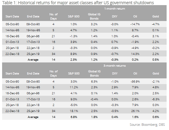 Past shutdown: A non-event for markets. The economic impact of a US government shutdown depends on its duration. The furloughing of workers will hit consumer sentiments and weigh on domestic consumption. Based on estimates by the CBO, the last government shutdown, which lasted five weeks, reduced US economic output by USD11bn. The impact on financial markets, however, will be more muted given the broad assumption that such episodes are typically short-lived. Based on our analysis of six shutdowns that took place since 1990, the key observations are: