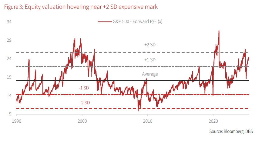 Watch your blind spots: Valuation and earnings risk. Since the trough of “Liberation Day”, the S&P 500 has rallied sharply as the market priced in falling policy risks and impending monetary easing. But the optimism is unfortunately not matched by fundamentals as the earnings forecast remains flat, contributing to the spike in valuations. At 24.3x forward P/E, valuation for the S&P 500 is edging close to the +2 SD expensive mark. Meanwhile, earnings momentum is showing signs of tapering off, particularly in the S&P 500 ex-technology space. Even within the technology space, unprofitable companies are expected to remain in the red through 2026.