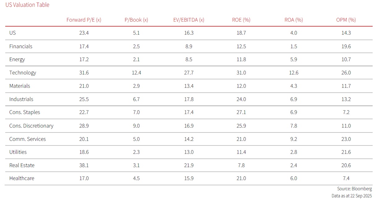 Cross-currents: Macro resilience vs policy concerns. The S&P 500 has staged a remarkable rebound since the trough of the “Liberation Day” sell-down, fuelled no less by Trump’s volte-face on tariffs threats and subsequent extension of timelines. More importantly, broad-based macro resilience and a “Goldilocks” trading environment also gave risk sentiments another boost. As we head into the final quarter of 2025, we expect the S&P 500 to navigate the cross-currents of stable macro conditions and rising policy concerns – especially those pertaining to Fed independence.