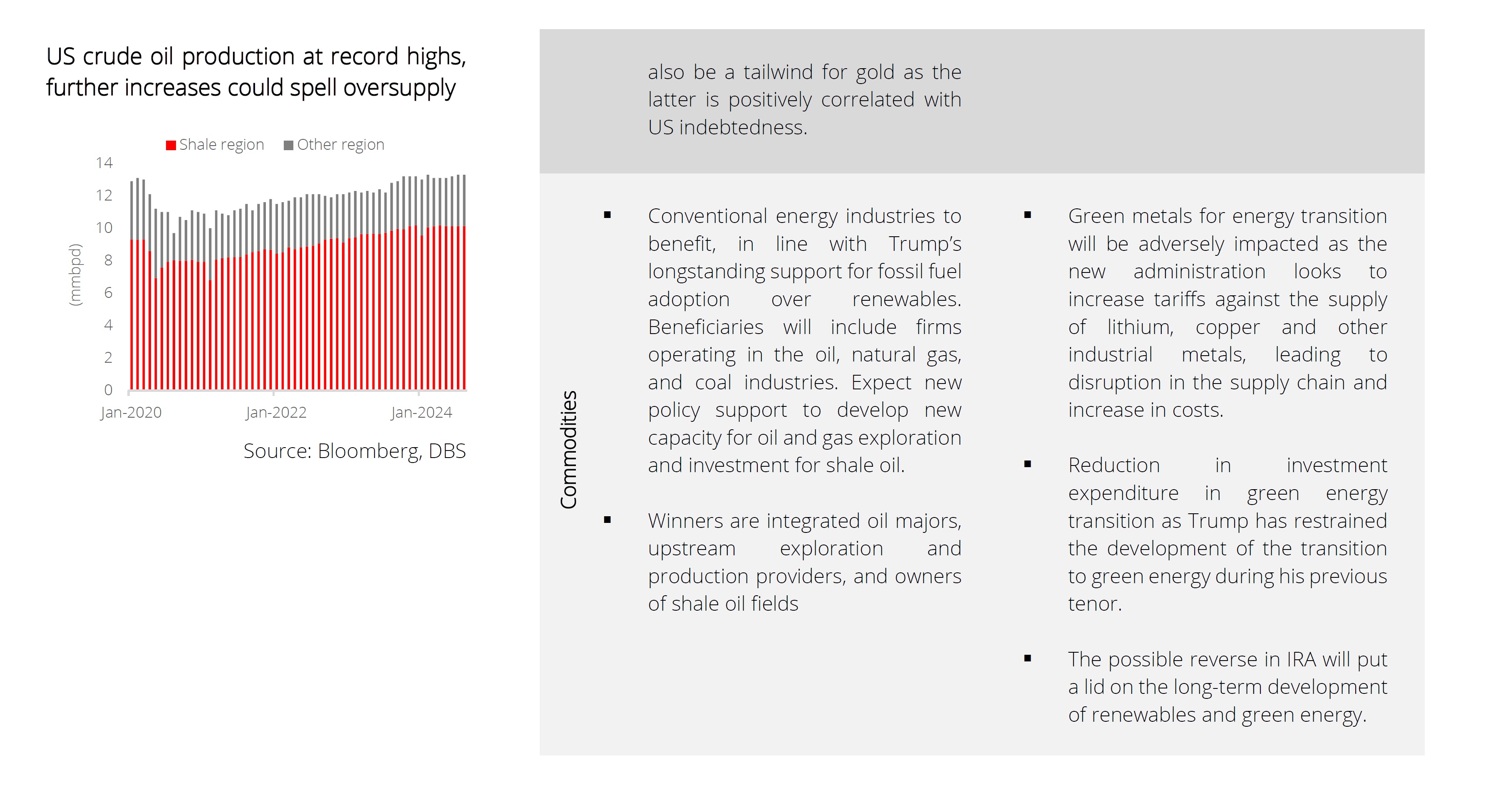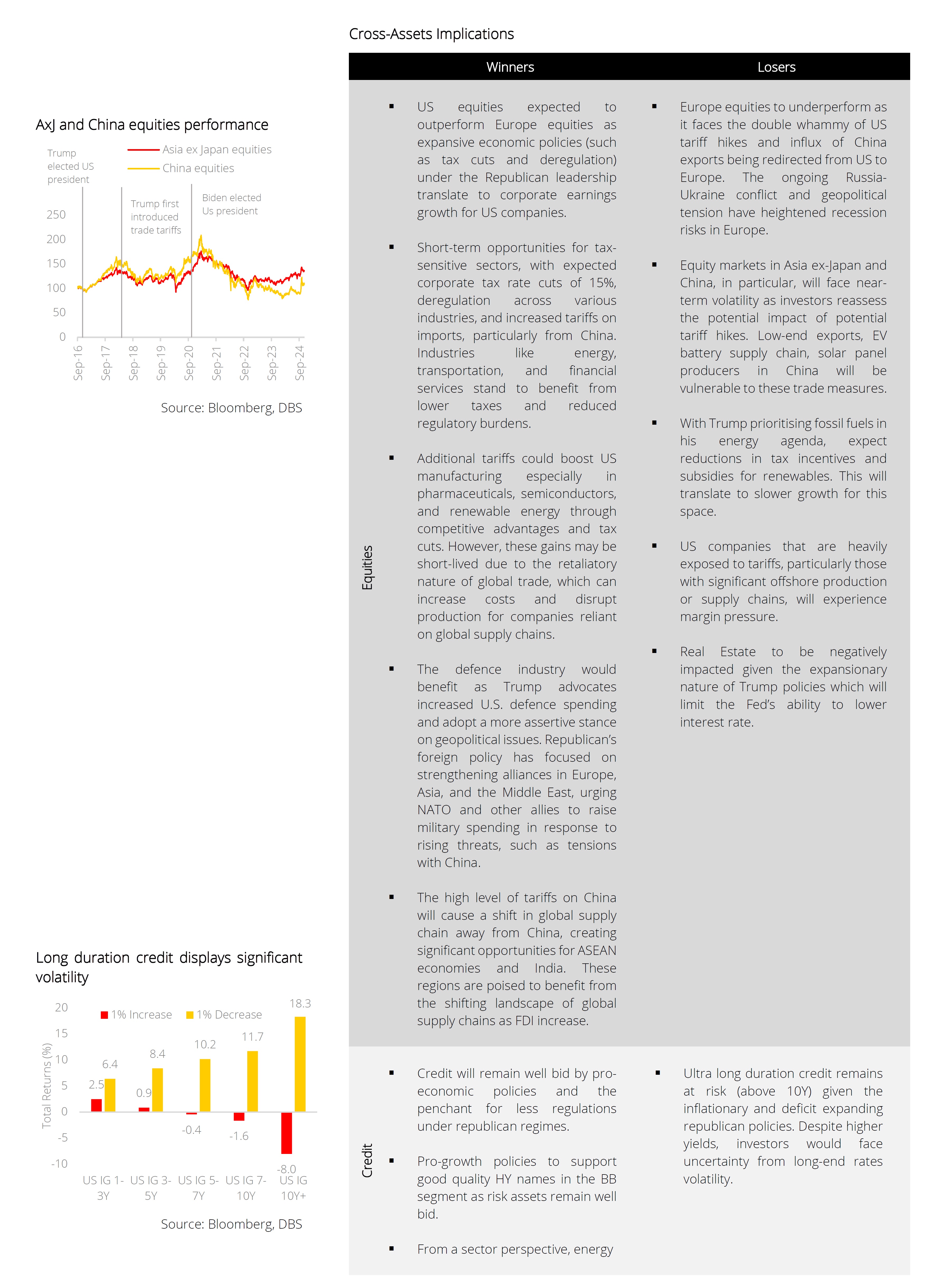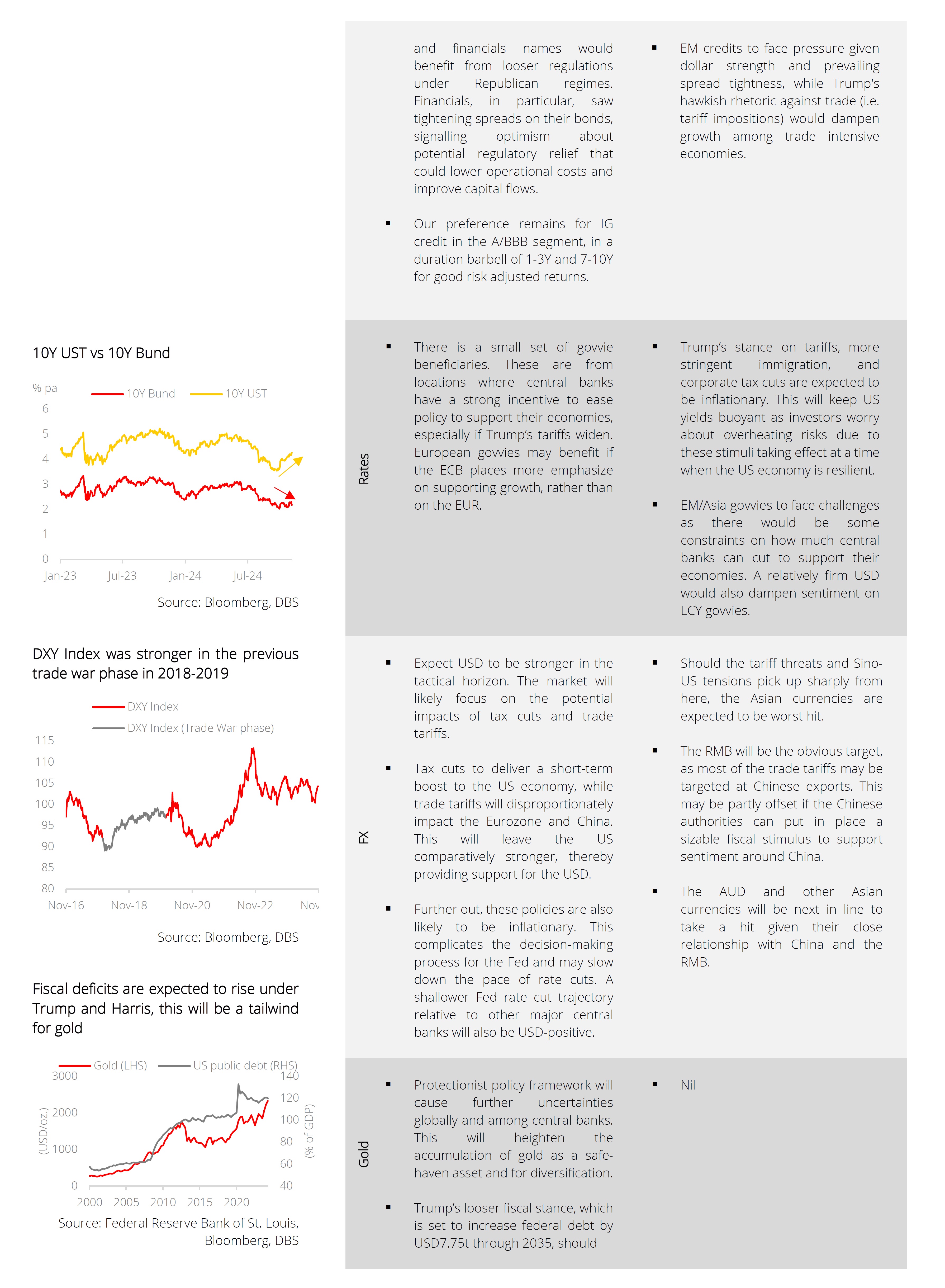 The Trump victory has already seen “Trump trades” going into overdrive with S&P 500 up 2.5%, US Dollar Index (DXY) rallying 1.6% and UST 10-year yield up 16 bps. Expect dollar strength to stay as the markets price in higher bond yields on expectations of rising tariffs and bond issuances to fund the taxation cuts. A Trump 2.0 will bring sweeping policies changes and these are the likely scenarios: