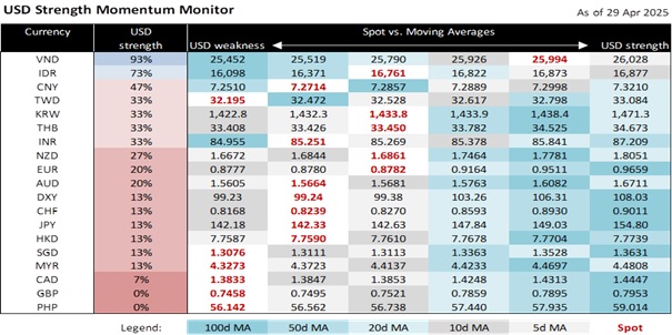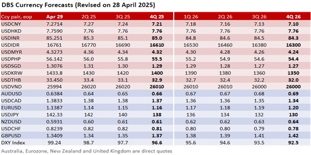 Looking into May, the IDR could play catch-up to the recovery in other Asian currencies. Dr Sri Mulyani was part of the delegation headed by Coordinating Minister for Economic Affairs Airlangga Hatarto in Washington D.C. for top-level discussions to address Trump’s 32% reciprocal tariff on Indonesia. The Jakarta Composite Index has rebounded to its highest level since February 24. The 5Y CDS for Indonesia’s USD debt has narrowed below 100 bps in the past week after its spike to 131 bps on April 9. A simple regression of USD/IDR against these market indicators implies that USD/IDR should be lower at 16345 vs. yesterday’s close of 16760.