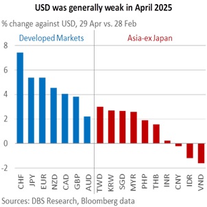 The DXY Index’s monthly loss increased to 4.8% in April from 3.2% in March. In the Developed Markets, the CHF and JPY were sought most as havens from the worst US stock market sell-off since 2022, driven by US President Donald Trump’s erratic policy announcements on tariffs. The USD’s credibility as the world’s dominant reserve currency was initially shaken by the DXY’s fall amid rising US bond yields, and later took a pounding from Trump undermining the Fed’s independence with his attacks on Fed Chair Jerome Powell. EUR and GBP were subsequently favoured as alternative reserve currencies. The commodity-led currencies – NZD, CAD, and AUD – fluctuated with commodity prices, which plunged on Trump’s “Liberation Day” tariff announcements and reversed course a week later on his 90-day pause for reciprocal tariffs.