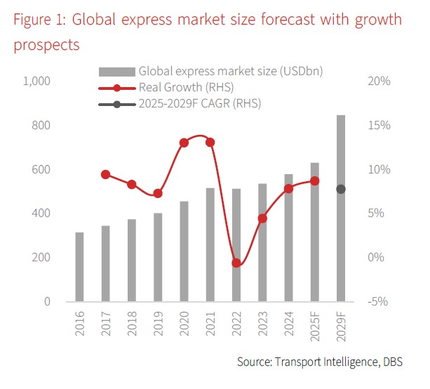 Sustained growth on e-commerce momentum. Despite the International Monetary Fund's (IMF) revised projection of a slowdown in global trade (in goods) growth to 2.0% in 2026F, the global express logistics sector is poised for robust expansion. The global express market is expected to deliver a 7.9% CAGR in 2025-2029F, following an elevated 8.8% y/y growth in 2025F. This resilience is underpinned by strong demand in the B2C segment, which is projected to grow at a substantial 10.8% CAGR, outpacing the sluggish 2.5% CAGR for the B2B segment.