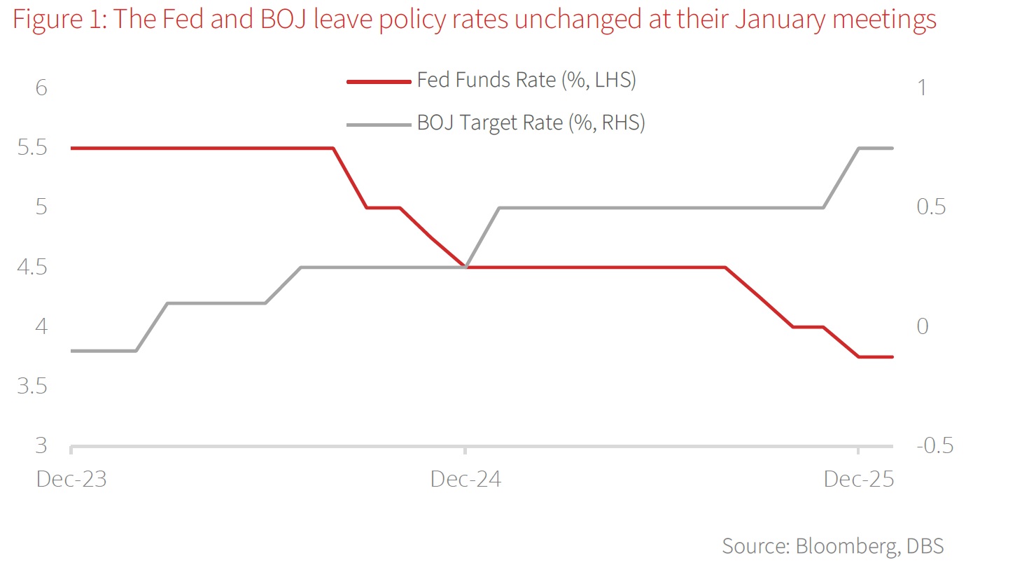Shifting to Japan, the Bank of Japan (BOJ) kept its policy rate unchanged at 0.75 at the 12 Jan meeting. On the economic outlook, the BOJ upgraded its growth forecasts, revising FY25 GDP growth to 0.9% from 0.7% and FY26 growth to 1.0% from 0.7%. Core-core CPI inflation forecasts were also revised higher to 3.0% from 2.8% for FY25 and to 2.2% from 2.0% for FY26. On the interest-rate outlook, Governor Ueda noted that wage hikes are exerting a growing influence on prices, and that April’s statistics will be a key factor in determining future rate hikes. In response to the surge in JGB yields, Ueda stated that the BOJ will conduct bond-market operations flexibly in exceptional cases to promote stable yield formation. On the weakening JPY, he added that exchange-rate movements may now have a greater impact on inflation than before and therefore warrant close monitoring.