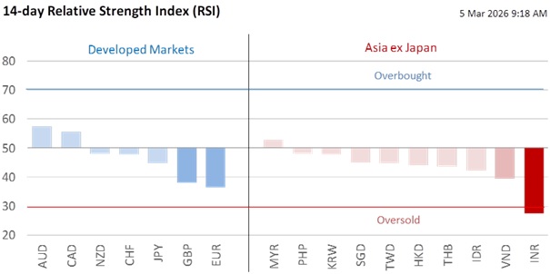 China’s NPC has announced its 2026 growth target as 4.5% to 5%, lowering it from the 5% target for 2025. China’s budget deficit will be kept unchanged at around 4% of GDP for 2026, with issuance of ultra-long special sovereign bonds and local government special bonds kept unchanged at CNY1.3trn and CNY4.4trn respectively. Without new fiscal impulse, the pace of RMB gains will likely be kept gradual to support growth, while RRR and rate cuts have also been flagged as possible tools to support the economy. Meanwhile, USD/CNH has stabilized at around 6.90, after having tested 6.94 amid USD strength. The scrapping of the 20% reserve requirement on FX forwards is a reversion to normal after RMB depreciation pressures fade, and is in line with a historical practice to lower the ratio back to zero when RMB strengthens, such as in Sep 2017 and Oct 2020.