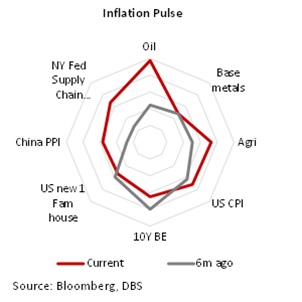 USD rates are keeping a wary eye on inflation over the coming months. US CPI reached 0.9% MoM (in line with consensus) in March as energy costs spiked by over 10%. Glaringly, the headline figure is now at 3.3% YoY, sharply higher than the 2.4% registered in the preceding month. Optimists might point to core inflation was relatively muted at 0.2% MoM, however, we are concerned that even if energy prices plateau around current levels, the knock-on impact unto core inflation (transport and goods that depend on energy-related inputs) would eventually show up.