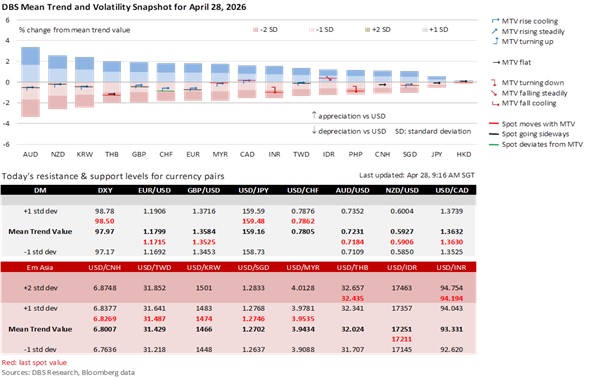 The DXY Index ended overnight barely changed from Friday’sclose of 98.5, supported by a fresh record high of 7173.91 in the S&P Index and a 3.9 bps increase in the US Treasury 10Y yield to 4.34%. The DXY had earlier declined to 98.2 during the Asian and European sessions on reports that Iran had submitted a new proposal via Pakistani mediators aimed at reopening the Strait of Hormuz in exchange for lifting the US naval blockade and decoupling nuclear talks for a later date. The proposal comes ahead of today’s third Democrat-sponsored War Powers Resolution vote in the House of Representatives. Even if the House passes the resolution, the Senate has already blocked five similar attempts. However, a House passage would create immense political pressure on the Trump administration ahead of May 1, or the 60-day clock’s expiry, to conduct military operations without congressional approval.