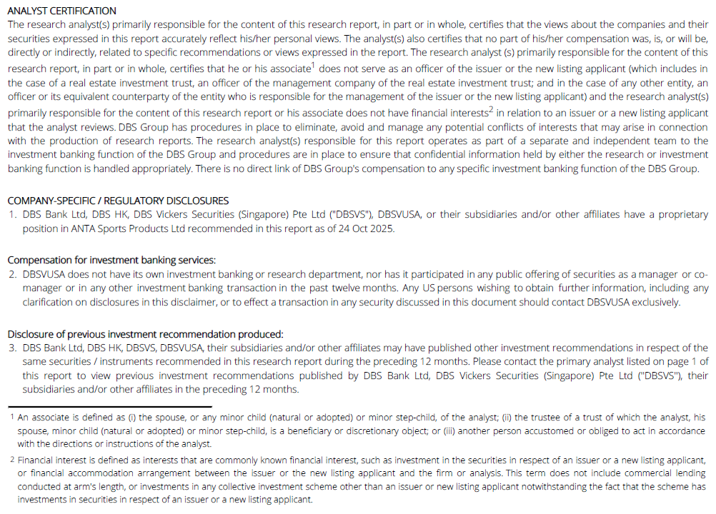 Any valuations, opinions, estimates, forecasts, ratings or risk assessments herein constitutes a judgment as of the date of this report, and there can be no assurance that future results or events will be consistent with any such valuations, opinions, estimates, forecasts, ratings or risk assessments. The information in this document is subject to change without notice, its accuracy is not guaranteed, it may be incomplete or condensed, it may not contain all material information concerning the company (or companies) referred to in this report and the DBS Group is under no obligation to update the information in this report.
