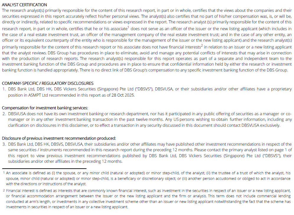 3Q25 earnings were slightly below expectations, while 4Q25 revenue guidance was above consensus. ASMPT reported 3Q25 revenue of HKD 3.66bn, up 9.5% y/y (+7.6% q/q), broadly in line with market forecasts and prior guidance. Group adjusted gross margin (excluding the inventory write-off from AEC’s voluntary liquidation) was 37.7% (down 3.3 ppts y/y) on a heavier SMT mix and softer SEMI mix/utilisation; statutory GM was 35.7%, and adjusted net profit was HKD 101.9mn (up 245.2% y/y), missing market consensus due to lower‑than‑expected growth in Advanced Packaging (AP). On a statutory basis, the group booked a net loss of HKD 268.6mn, dragged by HKD 304mn restructuring costs and HKD 73.9mn one‑off inventory write‑off linked to the voluntary liquidation of the Shenzhen AEC plant.