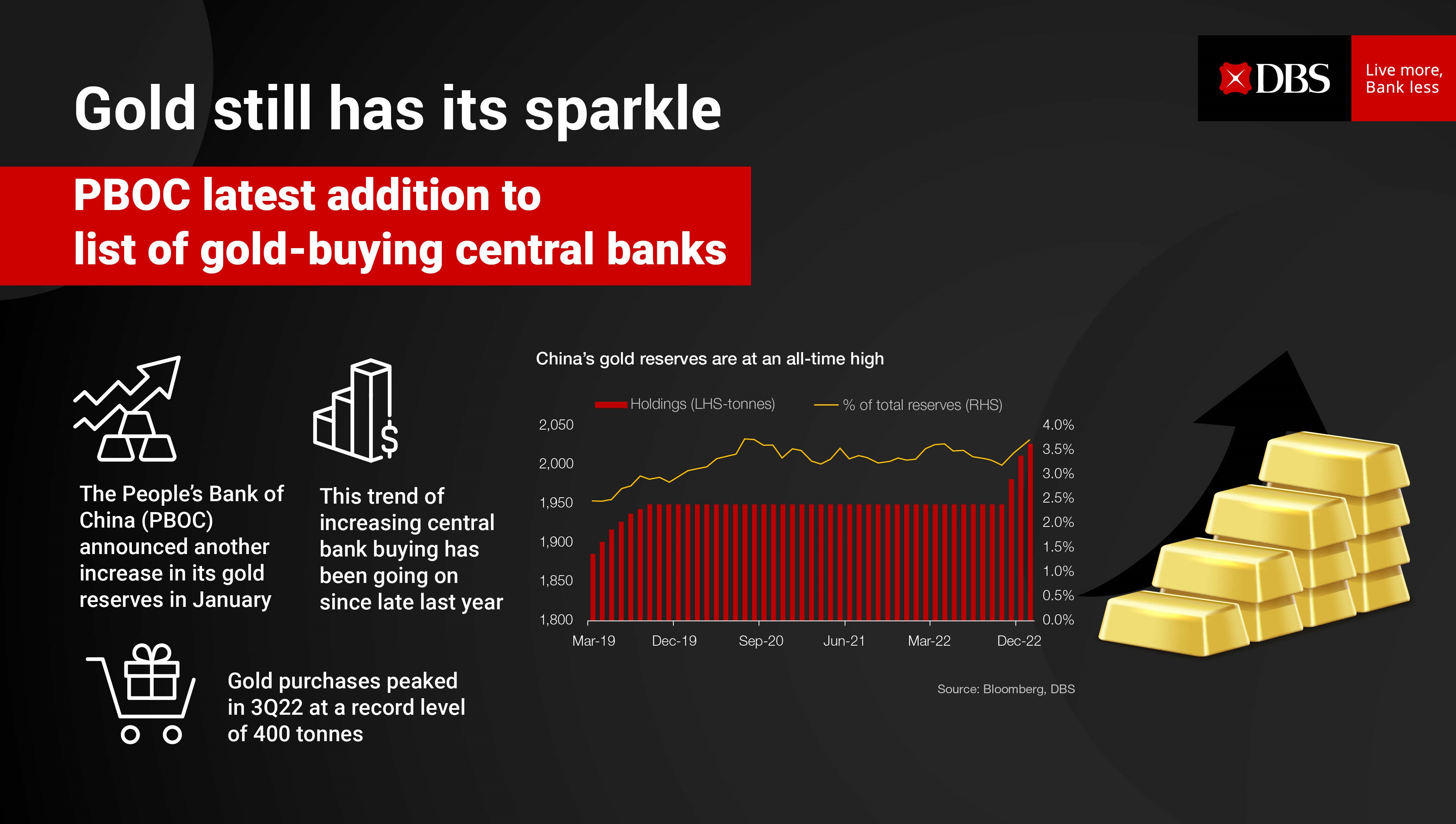 China joins the list of countries that are stocking up on gold, with the PBOC announcing yet another increase in its gold reserves in January. This trend of increasing central bank buying has been going on since late last year, peaking in 3Q22 at a record high of 400 tonnes. The motivation is multi-fold but one of the key reasons is to de-risk against the dollar and dollar assets as gold is a more 'neutral' store of value that is not cuffed to any individual economy, and gold is also resilient in geopolitical and financial crises.