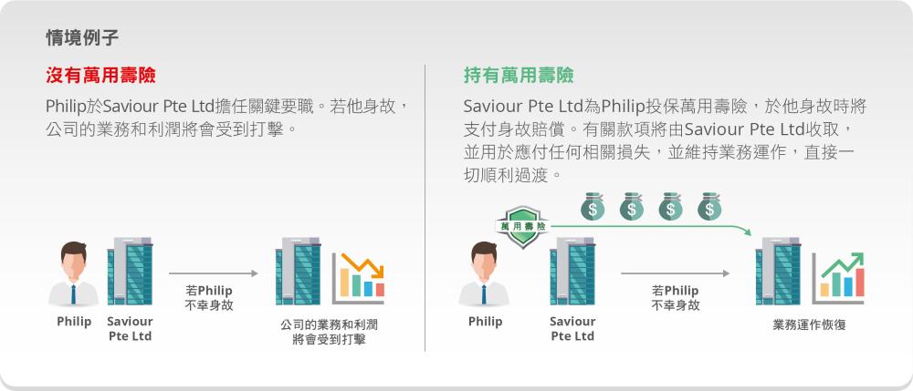 為了排除有關風險,您可以投保由宏利承保的萬用壽險,以保障損失關鍵人員時所帶來的影響。若有關人士身故,保單的身故賠償將會提供流動性資金,以支持您的業務繼續運作。