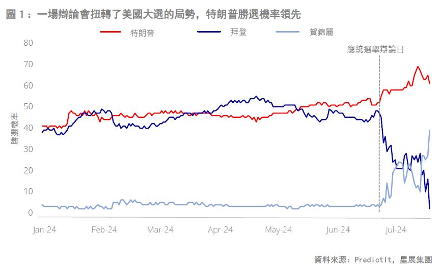 扭轉局勢。改變命運只需片刻–現任美國總統拜登在辯論會中表現不佳導致他的連任競選氣勢受挫。原本兩位領先候選人之間的緊張對決局勢現在已經演變成共和黨候選人特朗普(Donald Trump)顯著領先。然而,特朗普也經歷了一個改變命運的時刻;這位前總統被過了暗殺,並在選戰中取得領先。現在對於固定收益投資者而言,或許未來可能是更安心的評估,釐清特朗普第二任期政府可能對市場的影響。