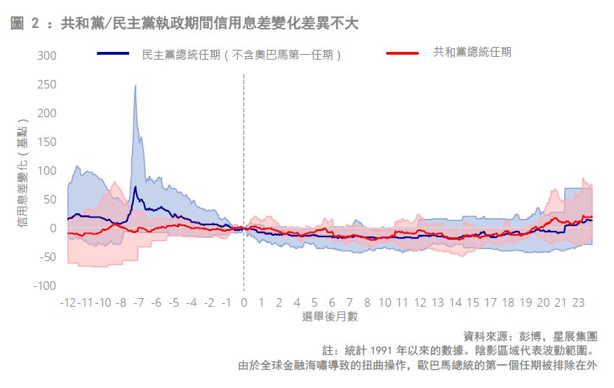 選舉本身對信用風險的影響有限。首先要注意的是,共和黨或民主黨執政期間的信用息差表現差異不大。考慮到其他因素(企業資產負債表實力、盈利能力、貨幣政策、流動性等)對息差有更大、更直接的影響,這是一個直觀的觀察。有趣的是,不論由哪個政黨執政,信用息差在選舉後 12 個月均呈現下降,可能是因為市場已消化四年一次的關鍵風險事件。