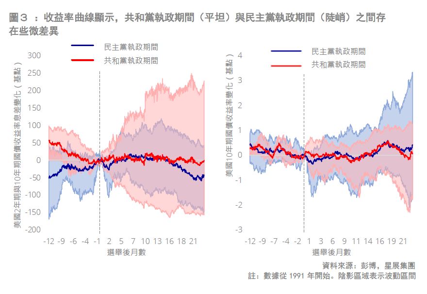 總統任期和國債收益率曲線。然而,國債收益率曲線似乎確實存在些微差異。在共和黨執政期間,國債收益率曲線在選舉前後的一年似乎趨於平坦,而在民主黨執政期間,國債收益率曲線在選舉前後的一年則是趨於陡峭。平均數據再次顯示,共和黨或民主黨執政期間息差變化差異不大,但有趣的是,波動範圍可能很大;例如,共和黨執政期間美國 10 年期國債收益率似乎在選後兩年處於較低的波動區間,而民主黨執政期間波動區間似乎較大。