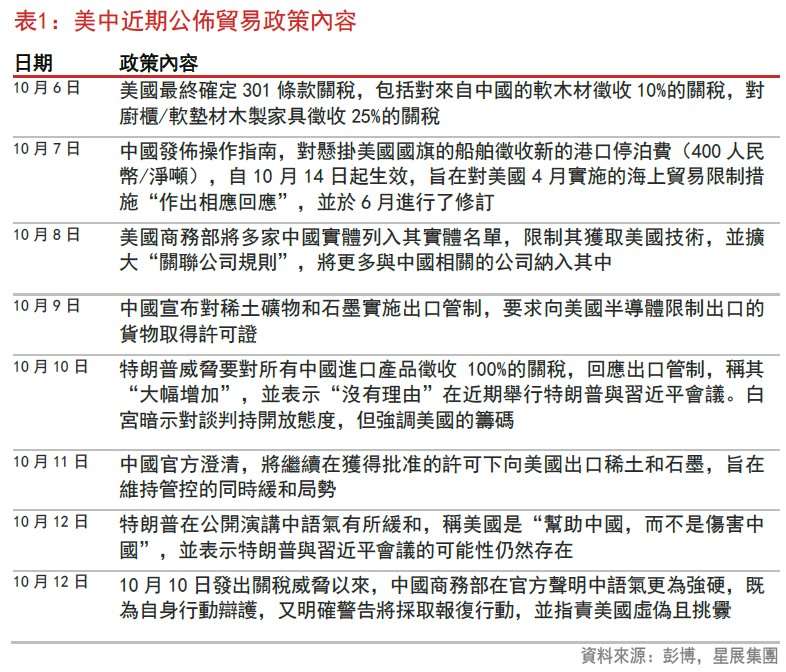再次針鋒相對的關稅戰。中美長期針鋒相對的關稅戰再度升溫,打破了雙方緩和關係的樂觀論調。上週,雙方緊張形勢再次升級,中國官方加強對稀土礦物和石墨的出口管制,直接回應美國官方進一步限制取得美國技術。隨後特朗普政府威脅對中國出口產品將額外課徵100%的懲罰性關稅。兩國都擺出了強硬的姿態,但矛盾的是,他們同時確認了繼續談判的意願。