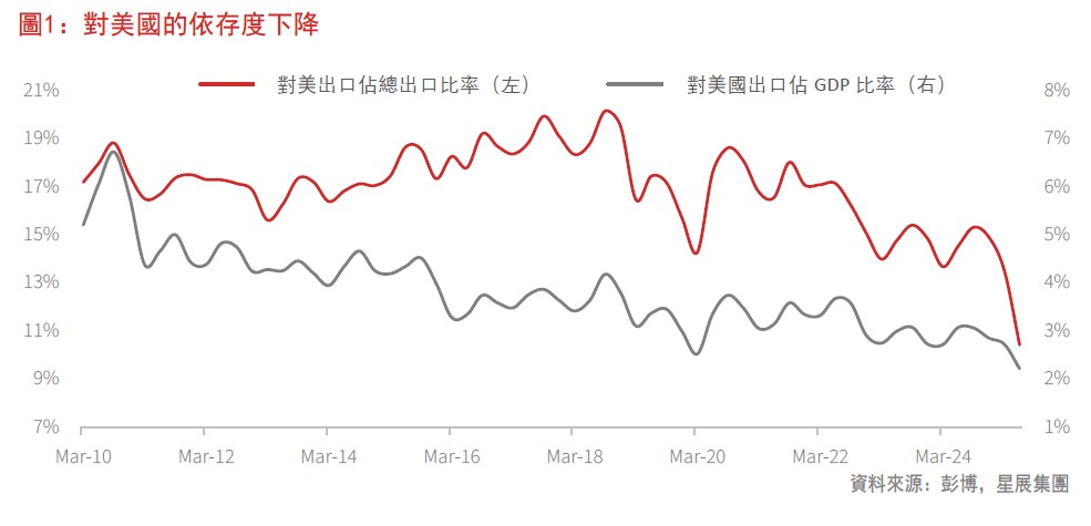 中國對美國出口大幅下降。由於中國官方積極加強與其他貿易夥伴的商業聯繫,中國對美出口在2025年第3季僅佔中國出口總額的10%(約佔GDP的2%),大幅低於2019年前的約20%(約佔GDP的4%)。同時,早在現任政府發表最新言論之前,美國科技相關出口就已經受到了嚴格的管控。因此,即使這些威脅完全成為現實,實際影響似乎也是可控的;事實上,在某些方面,這也強化星展集團對中國股市建設性的觀點。
