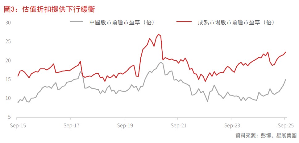 估值折扣提供下調保護。至關重要的是,儘管在2025年第3季受國內外資金流動回升的帶動下出現強勁反彈,但中國股市與成熟市場股市之間的估值折扣仍顯著,約30%至35%。這種折扣使中國股市處於有利地位,既能作為抵禦貿易關稅帶來的不確定性的緩衝,也是尋求區域配置多元化的投資者一個有吸引力的選擇。