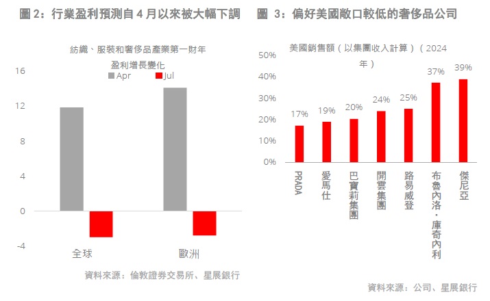 15%的對歐關稅仍構成顯著風險。歐盟和美國已就歐盟輸美商品徵收15%關稅達成協議,而自美國解放日其歐盟商品已被徵收10%的關稅。雖然此次關稅低於特朗普本月初所威脅的30%,但奢侈品行業將難以從中獲益,在全球經濟前景惡化的情況下仍將持續面臨需求壓力。因此,市場對全球奢侈品行業的盈利增長預測已從4月初的+12%下調至-3%。